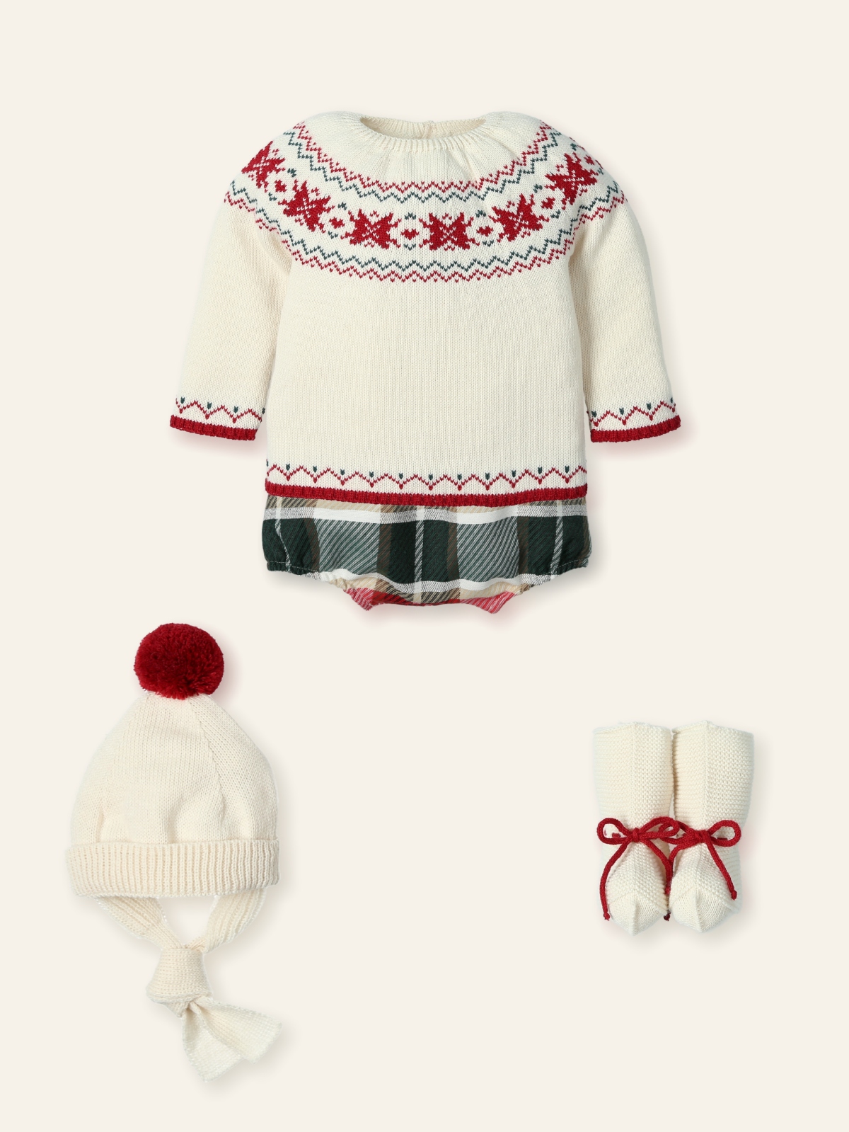 Increible conjunto de cuatro de piezas de la marca Mac Ilusion. Esta compuesto por jersey en color crema con greca de un brazo al otro y en la parte de abajo del jersey. Pantalonde cuadros en color rojo y verde. LLeva gorro y patucos en color crema a conjunto con el jersey.