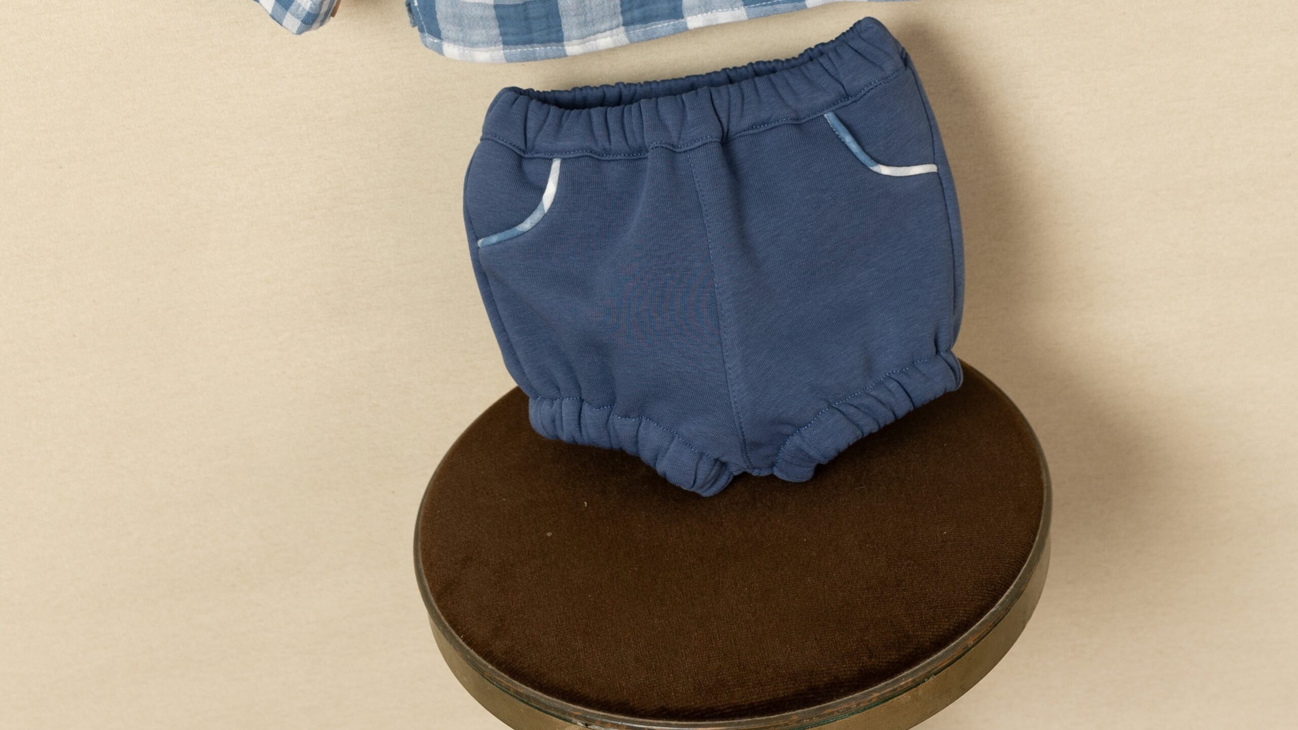 Maravilloso conjunto de dos piezas de la marca Basmarti. Conjunto de dos piezas de la coleccion pompidou. Esta compuesto por sudadera en color azul con puños en cuadro vichy azul y blanco. Lleva serigrafia de perrito. Pantalon corto en azul con cinturilla elastica.