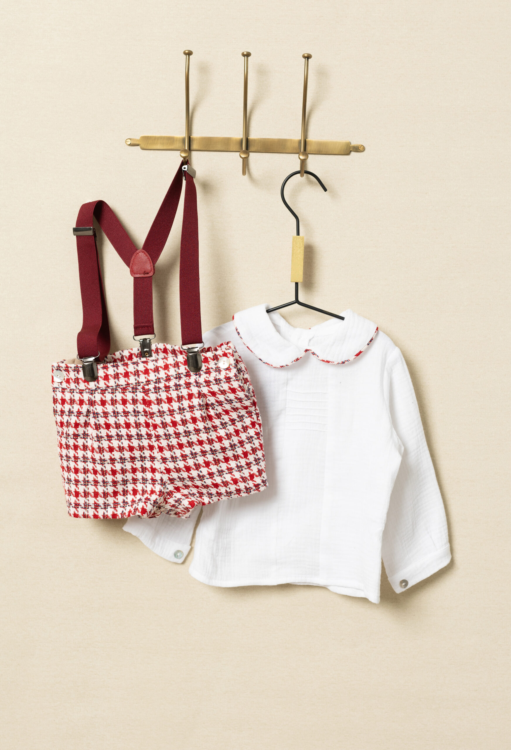 Maravilloso conjunto de dos piezas de la marca Basmarti. Conjunto de dos piezas de la coleccion el prado. Esta compuesto por camisa crema con cuello y con cierre por detras. Pantalon corto a juego en color rojo estampado, completa un look comodo, calentito y elegante. Lleva tirantes a juego que le da un toque muy sofisticado.
