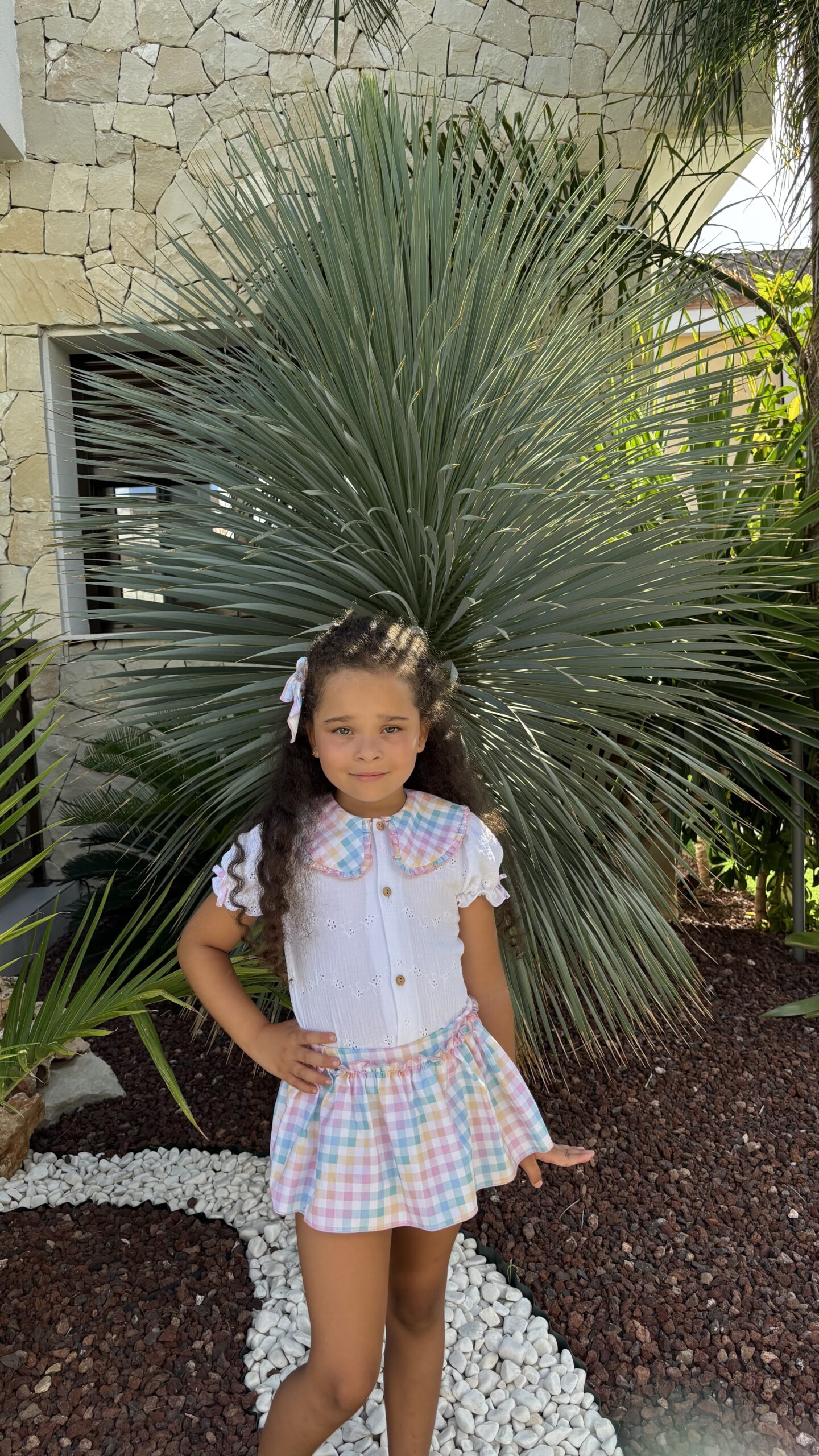 Bonito conjunto de dos piezas de la marca Daniesty. Esta compuesto por falda de vuelo estampada de cuadros y blusa blanca de manga corta abullonada con detalle de lazos en los dos lados del mismo estampado que la falda. Tambien lleva cuello de la misma tela de la falda. Ademas la falda lleva braguita para mas comodidad.
