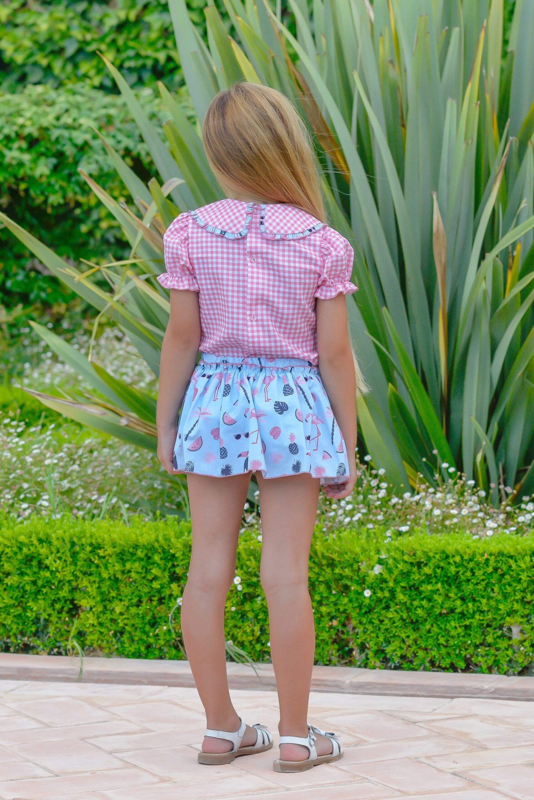 Increíble conjunto de falda de la marca Daniesty. Esta compuesto por falda estampada de flamencos, lleva braguita para mas comodidad. Blusa de manga corta en cuadro vichy rosa, ademas lleva cuello ribeteado con el mismo estampado de la falda. Cierra en la espalda.