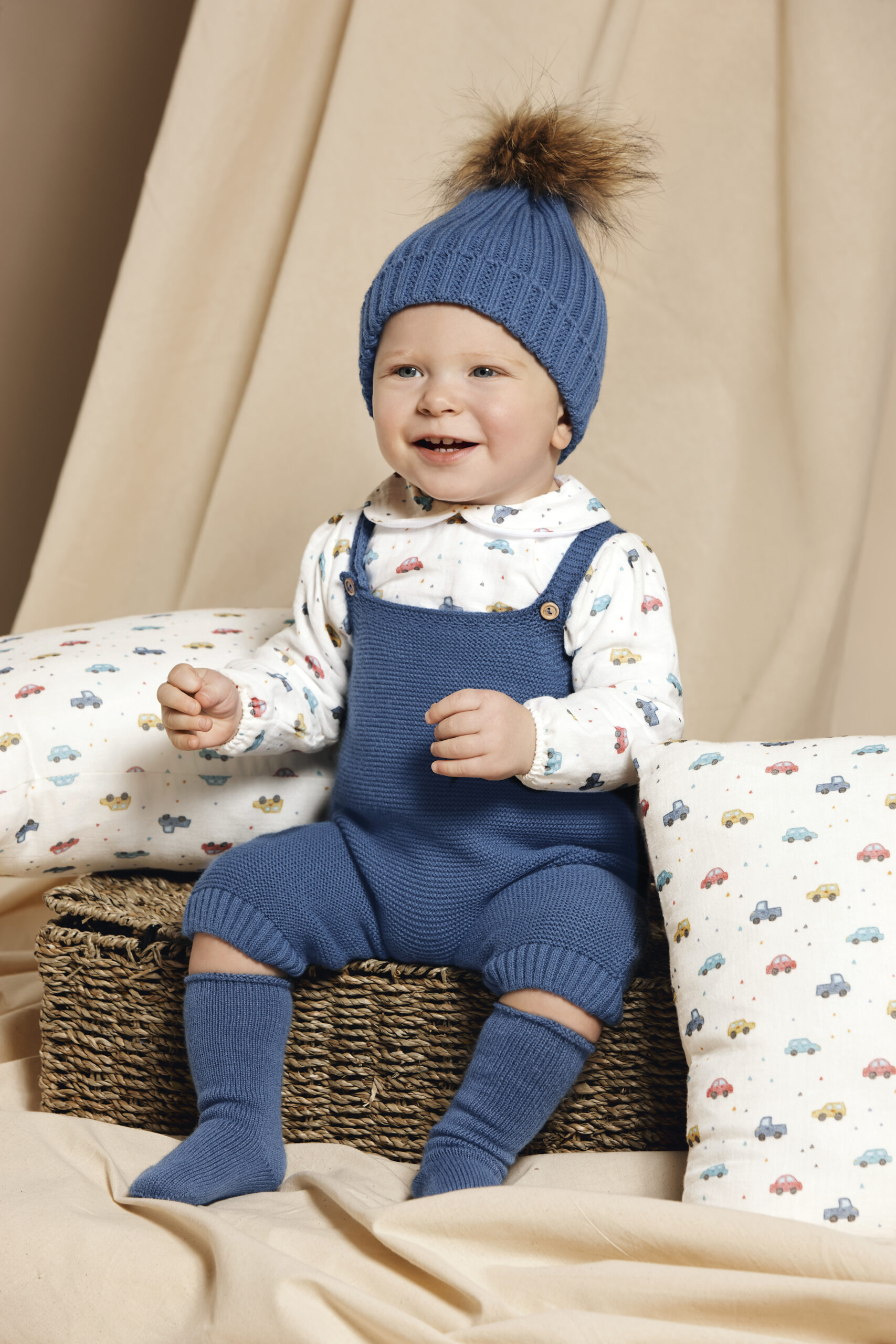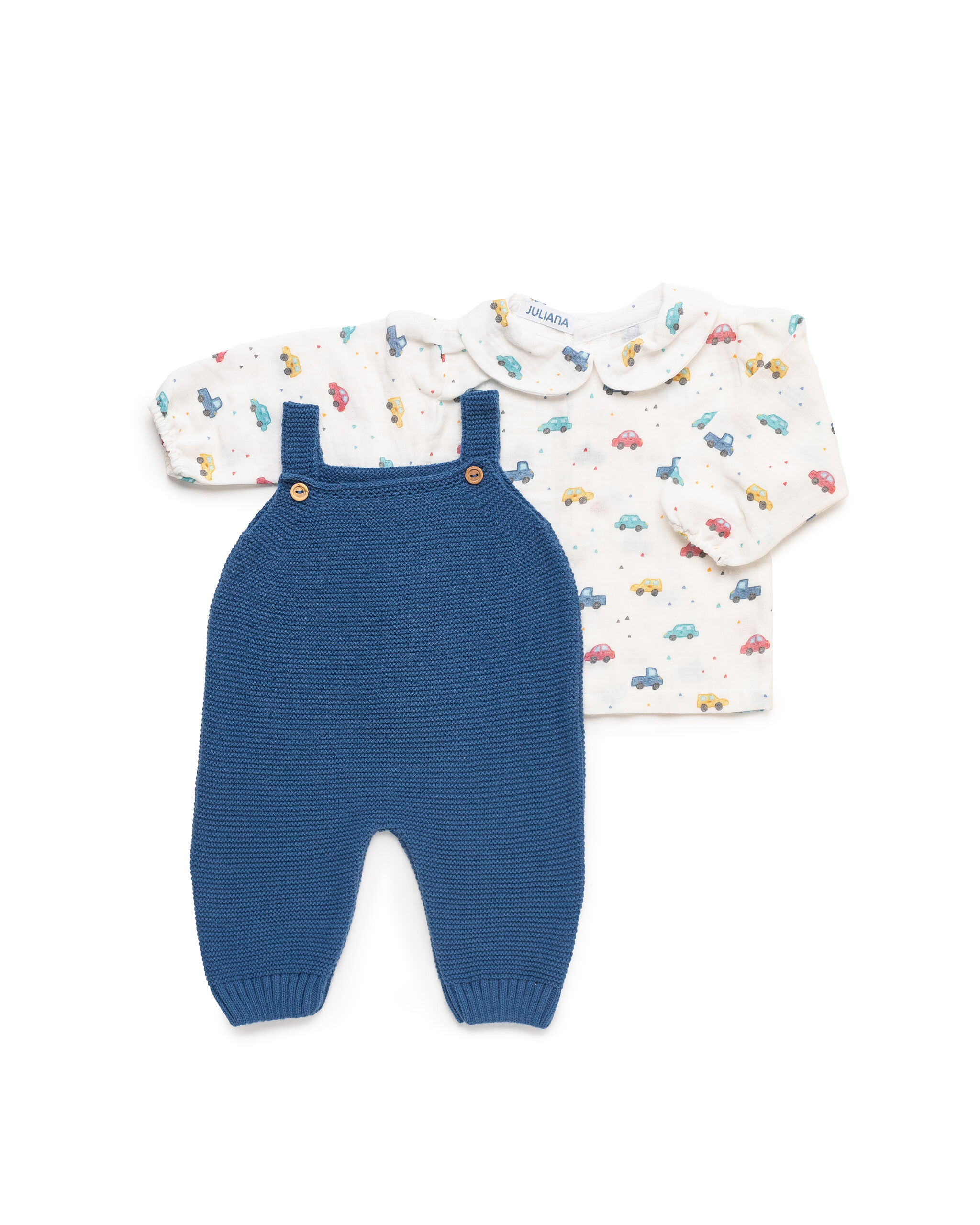 Maravilloso conjunto de dos piezas para niño de la marca Juliana. Esta compuesto por blusa con estampado de coches de colores y con cuello bebe con el mismo estampado. Cierre por detras para facilitar la puesta. Peto de punto en color azul azafata.