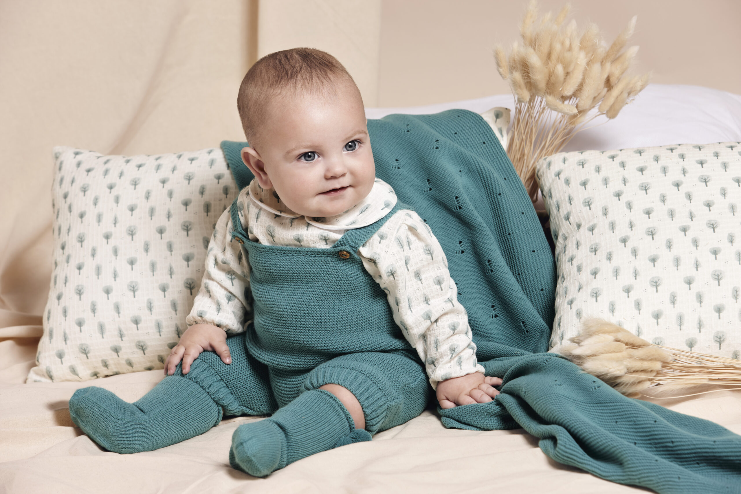 Maravilloso conjunto de dos piezas para niño de la marca Juliana. Esta compuesto por blusa con estampado de arboles y cuello de bebe con el mismo estampado. Cierre por detras para facilitar la puesta de la prenda. Peto de punto en color verde baltico. Conjunto ideal para los mas peques de la casa.