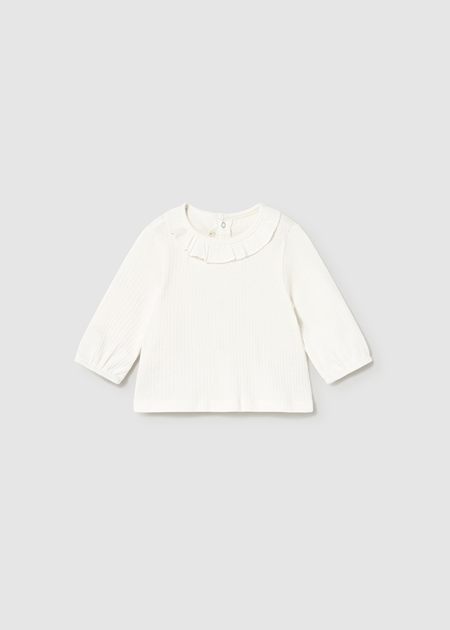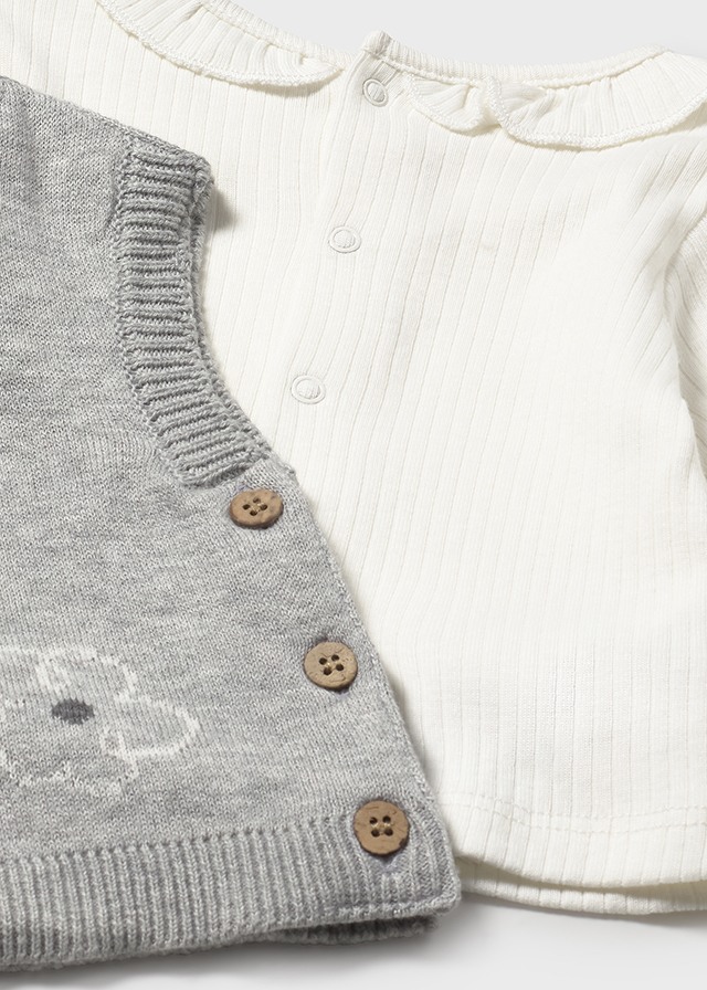 Original conjunto de tres piezas para recien nacida. Camiseta de manga larga con cuello redondo con volante. Cierre con botones a presion en la parte posterior. Chaleco sin mangas para recien nacida, cuello redondo. Cierre con botones en la parte delantera. Boton en el hombro para facilitar la puesta de la prenda. Pantalon tipo legging con cinturilla elástica.