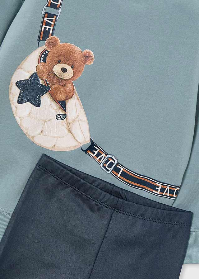 Conjunto de legging con sudadera de la marca Mayoral. Conjunto de sudadera y legging petroleo a juego para niña. Sudadera de manga larga en color azul para niña. Cuello redondo. Elementos de adorno: serigrafía.