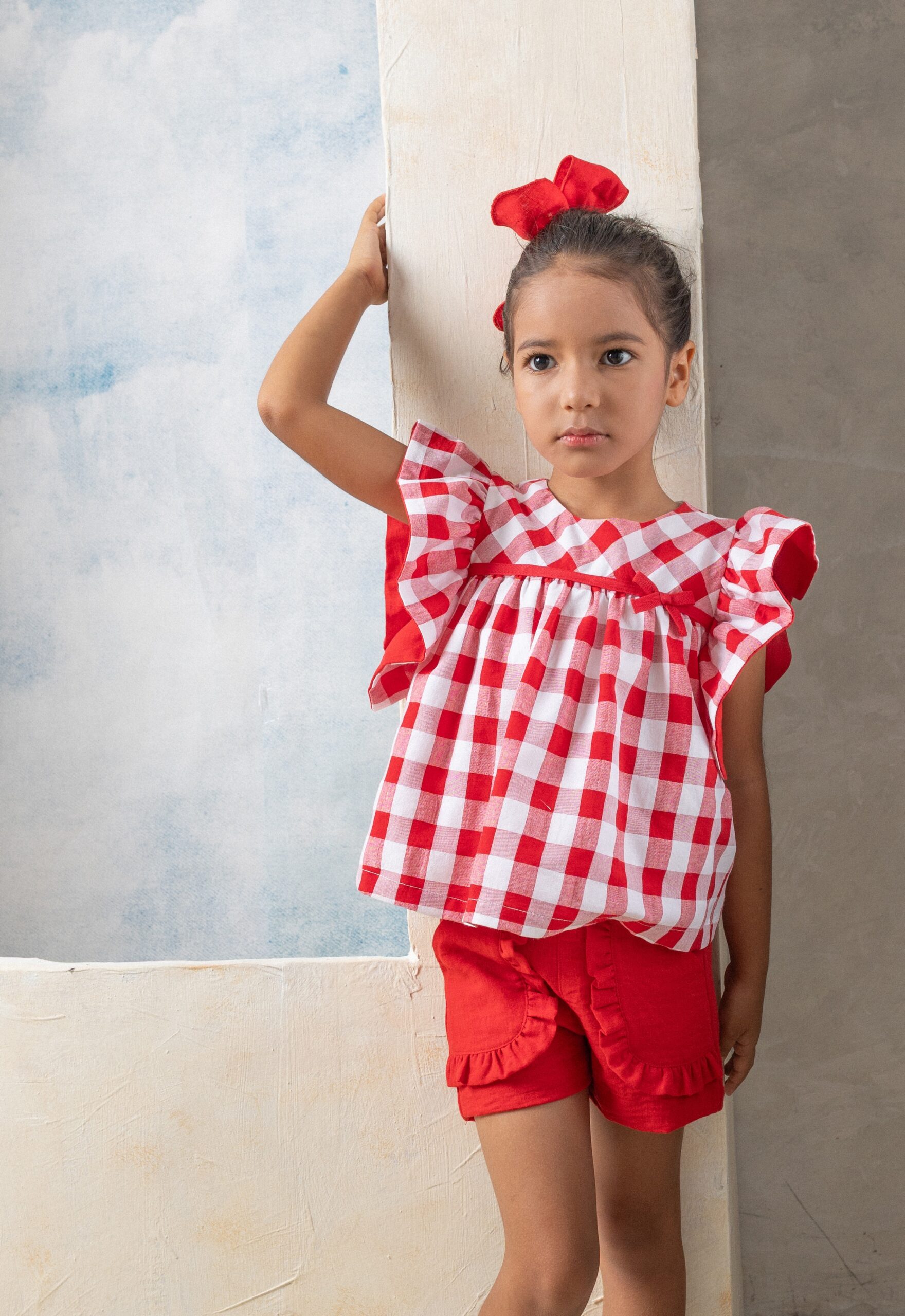 Precioso conjunto de cuadro vichy rojo de la marca Basmarti. Esta compuesto por blusa en cuadro vichy rojo y blanco, Tiene un bonito volante en los hombros y lleva corte en el pecho para darle vuelo. Ademas lleva pantalon corto en color rojo y dos bonitos bolsillos laterales.