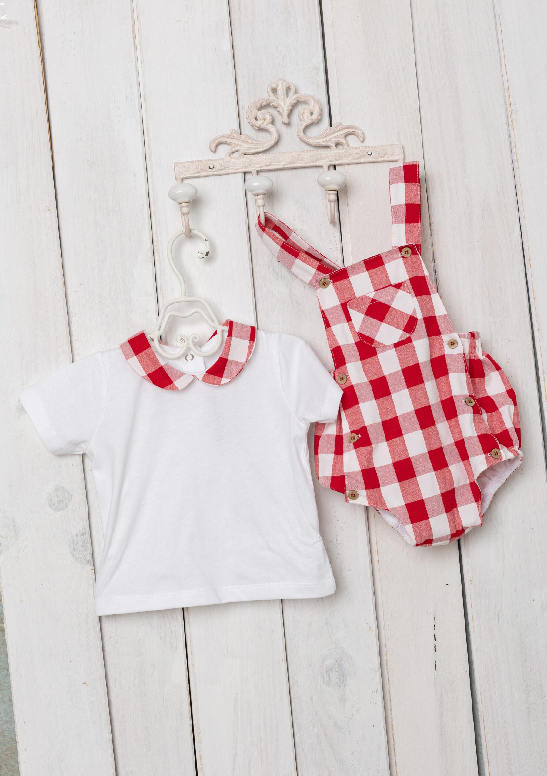 Precioso conjunto de la marca Basmarti. Esta compuesta por camiseta de manga corta basica blanco y pelele a cuadros en color rojo. Pelele tipo peto con bolsillo funcional en el centro. Ademas lleva tres botones laterales en cada uno de los lados para facilitar la puesta. Camiseta sin cuello de cuadros.