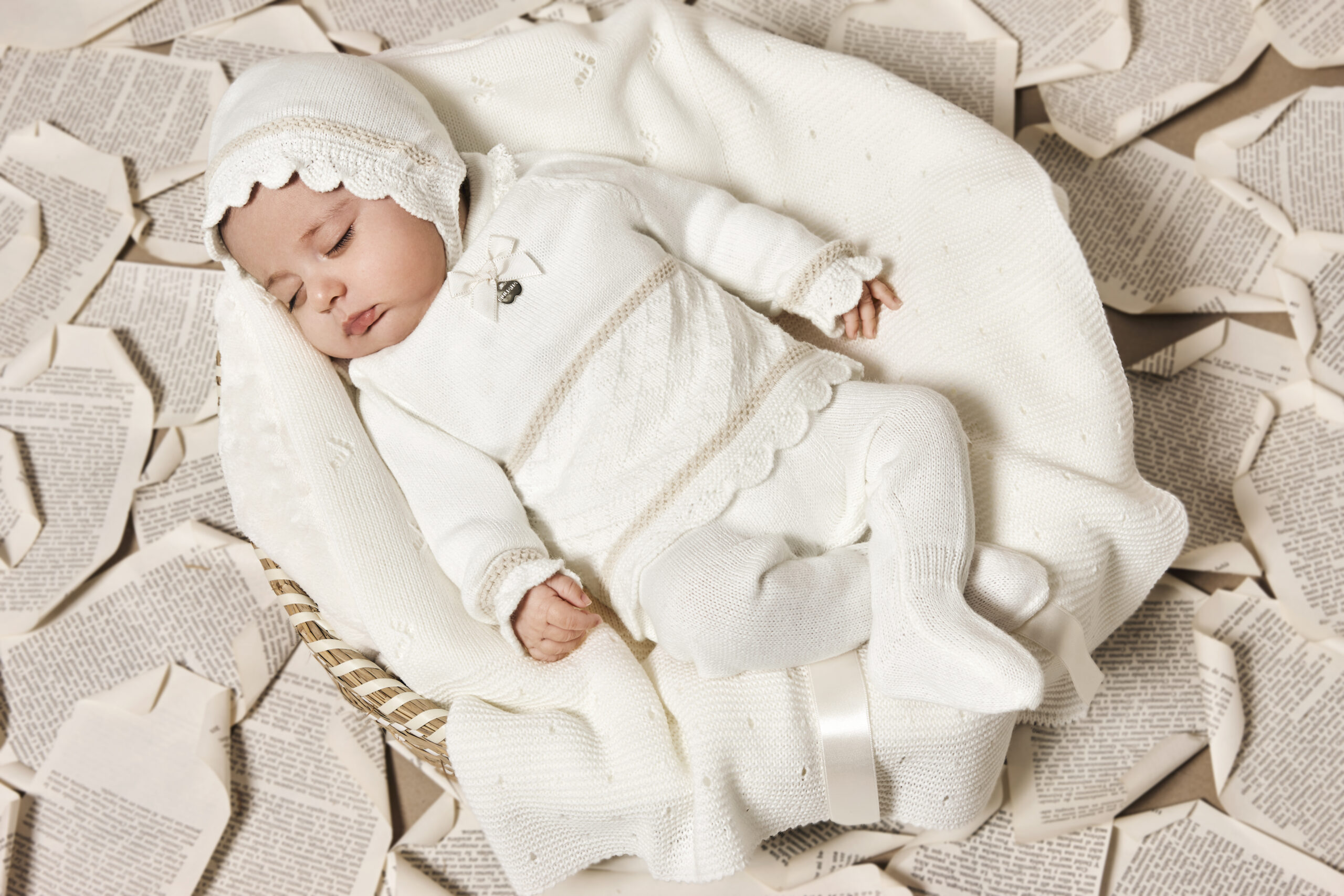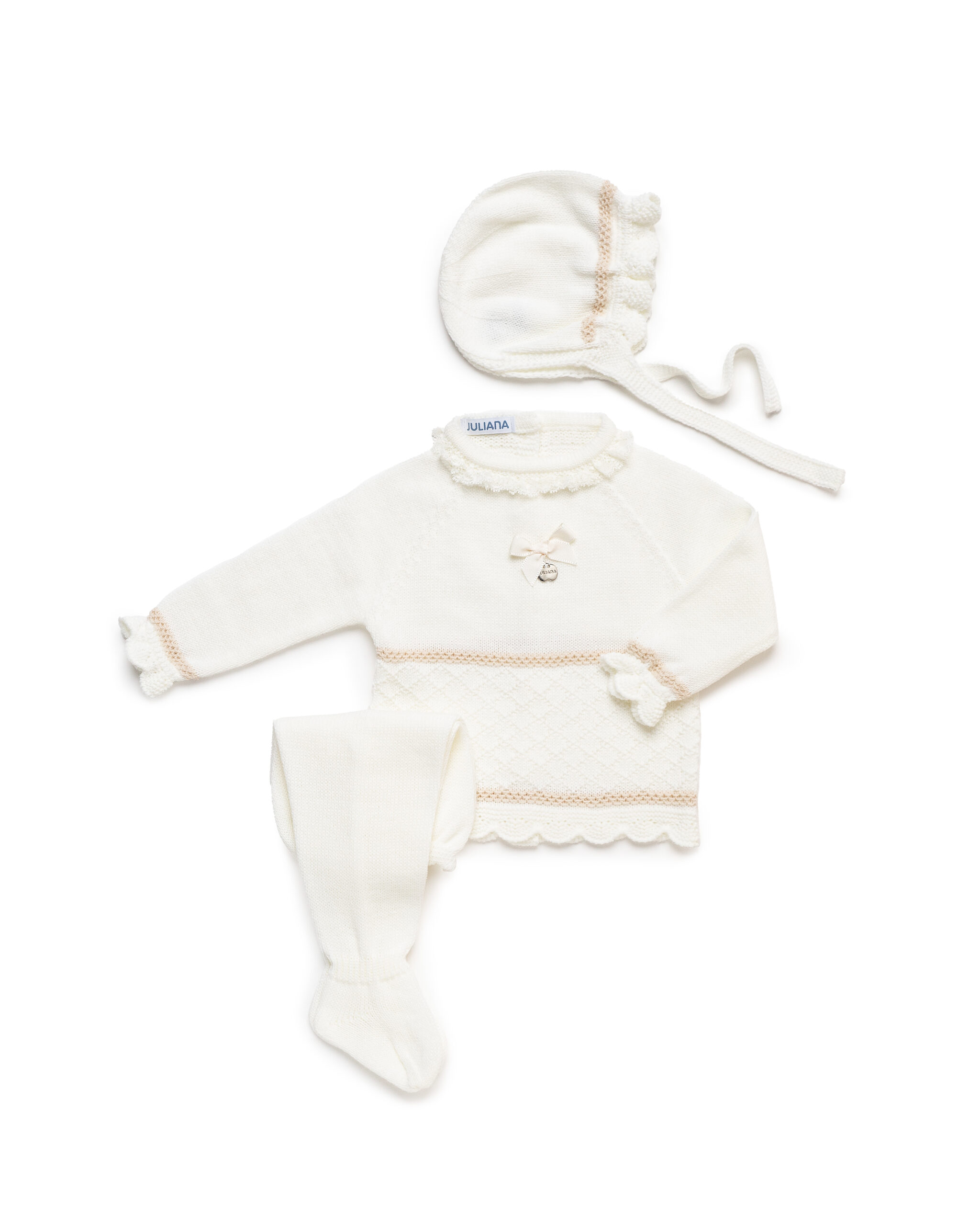 Bonito conjunto de polaina de la marca Juliana. Conjunto de polaina en punto de tres piezas en color crema. Esta compuesto por jersey en fondo crema con dos rayas en color tostado. LLeva una pequeña puntilla alrededor del cuello. Polaina a juego en color crema. Gorro a juego en crema con una raya en tostado.