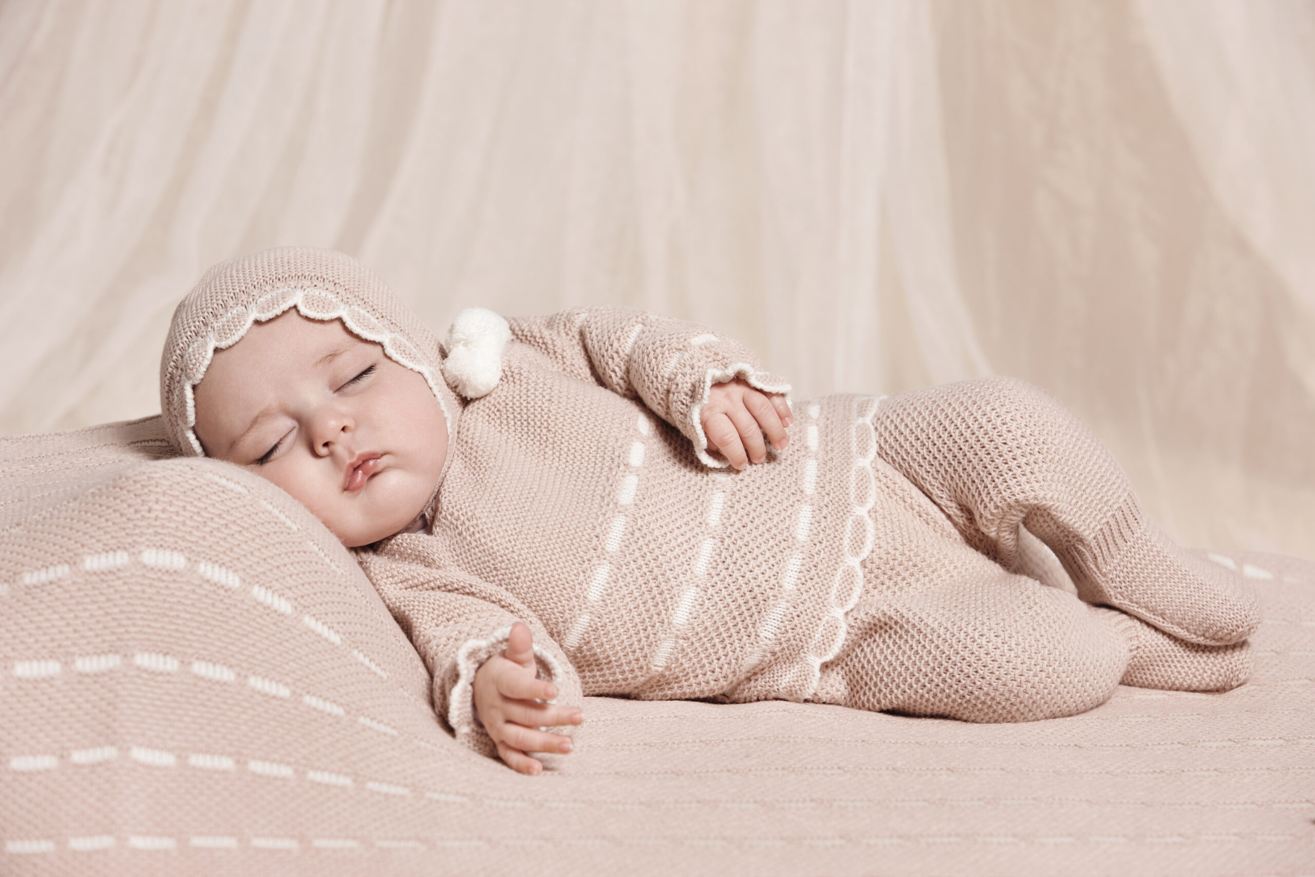 Bonito conjunto de polaina de la marca Juliana. Conjunto de polaina en punto de tres piezas en color rosa palo. Esta compuesto por jersey con fondo rosa palo combinado con bodoques en color crema. Ademas lleva dos pompones pequeños para darle un toque mas dulce. Polaina a juego en rosa palo. Gorro tambien a juego con bordes en tonos crema.