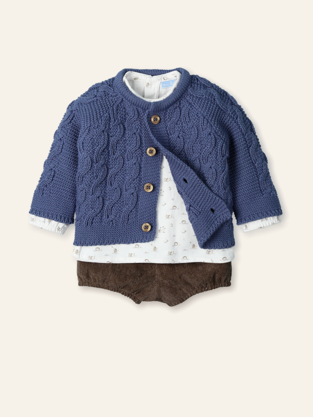 Maravilloso conjunto de tres piezas de la marca Mac Ilusion. Esta compuesto por chaqueta de punto en color azul noche. La camisa esta estampada con animalitos y cierre por detras. Pantalon corto con goma en la cintura en color marron.