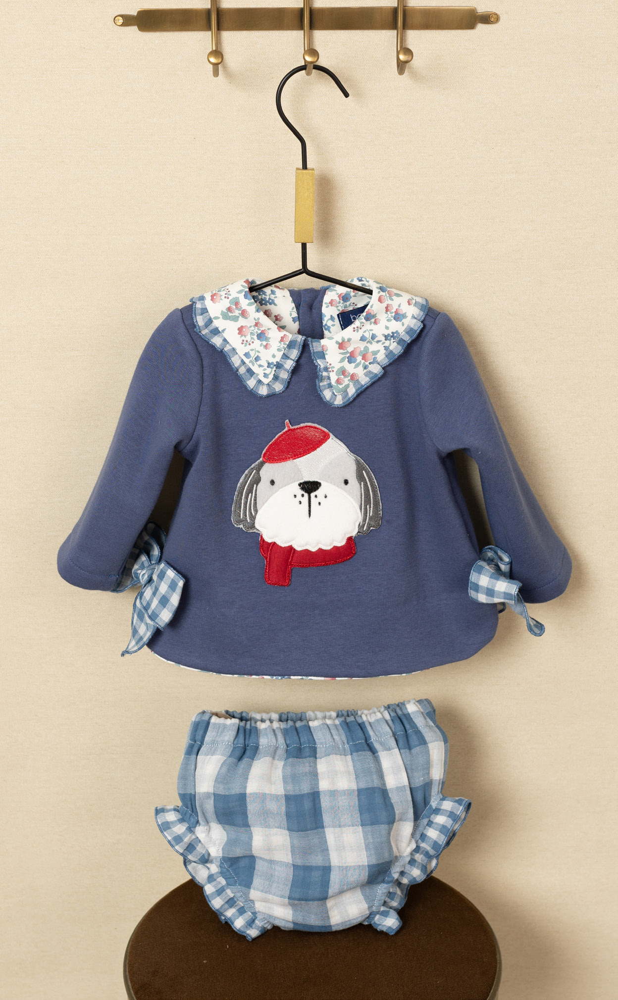 Jesusito bebe azul de la marca Basmarti. Jesusito de la coleccion pompidou. Consta de Sudadera con volante en el cuello con estampado de flores. Lleva serigrafia de perrito. Ademas tiene 2 lazos laterales en cuadro vichy azul y blanco. Cierre por detras con botones. Braguita a juego en cuadro vichy blanco y azul.