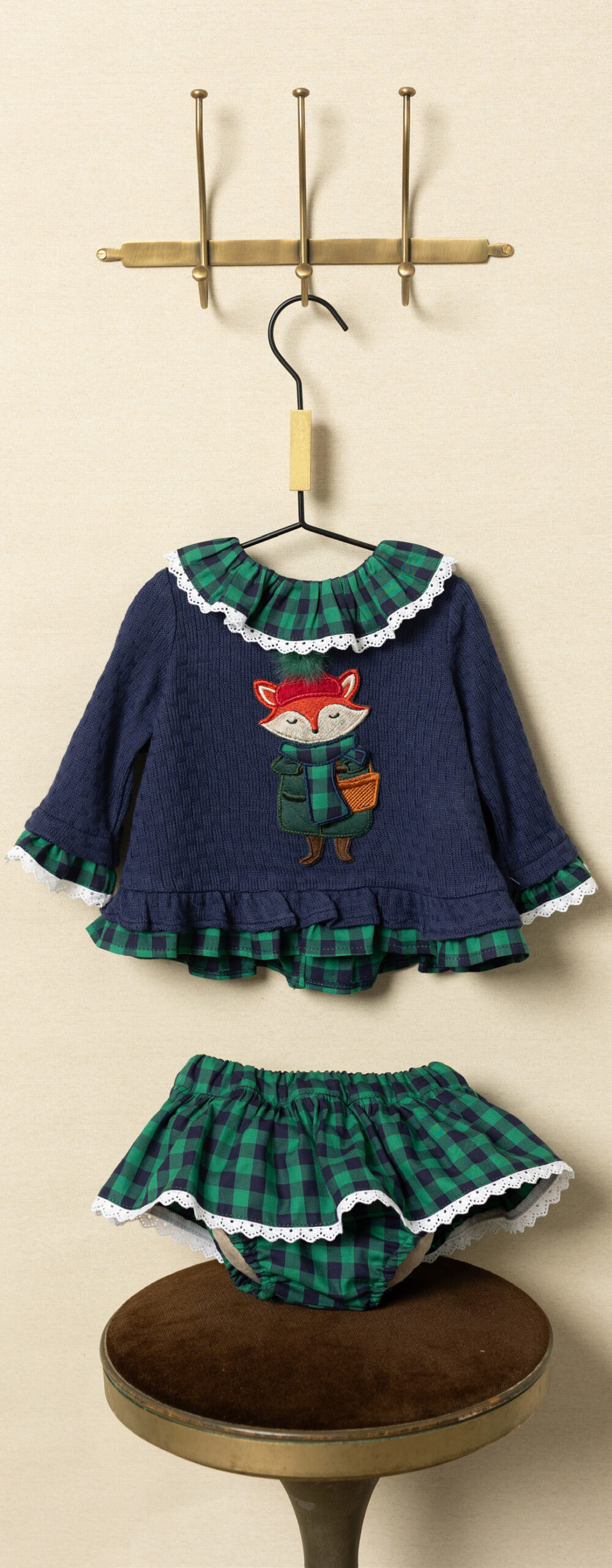 Jesusito bebe cuadros verde de la marca Basmarti. Jersey en punto tipo nido de abeja en color marino. Tiene cuello de volante con estampado de cuadros verde y marino y una pequeña puntilla alrededor que le da un toque mas sofisticado. Cierre por detras para facilitar el cambio. Braguita a juego de cuadros verde y marino con volante de la misma forma que el cuello.