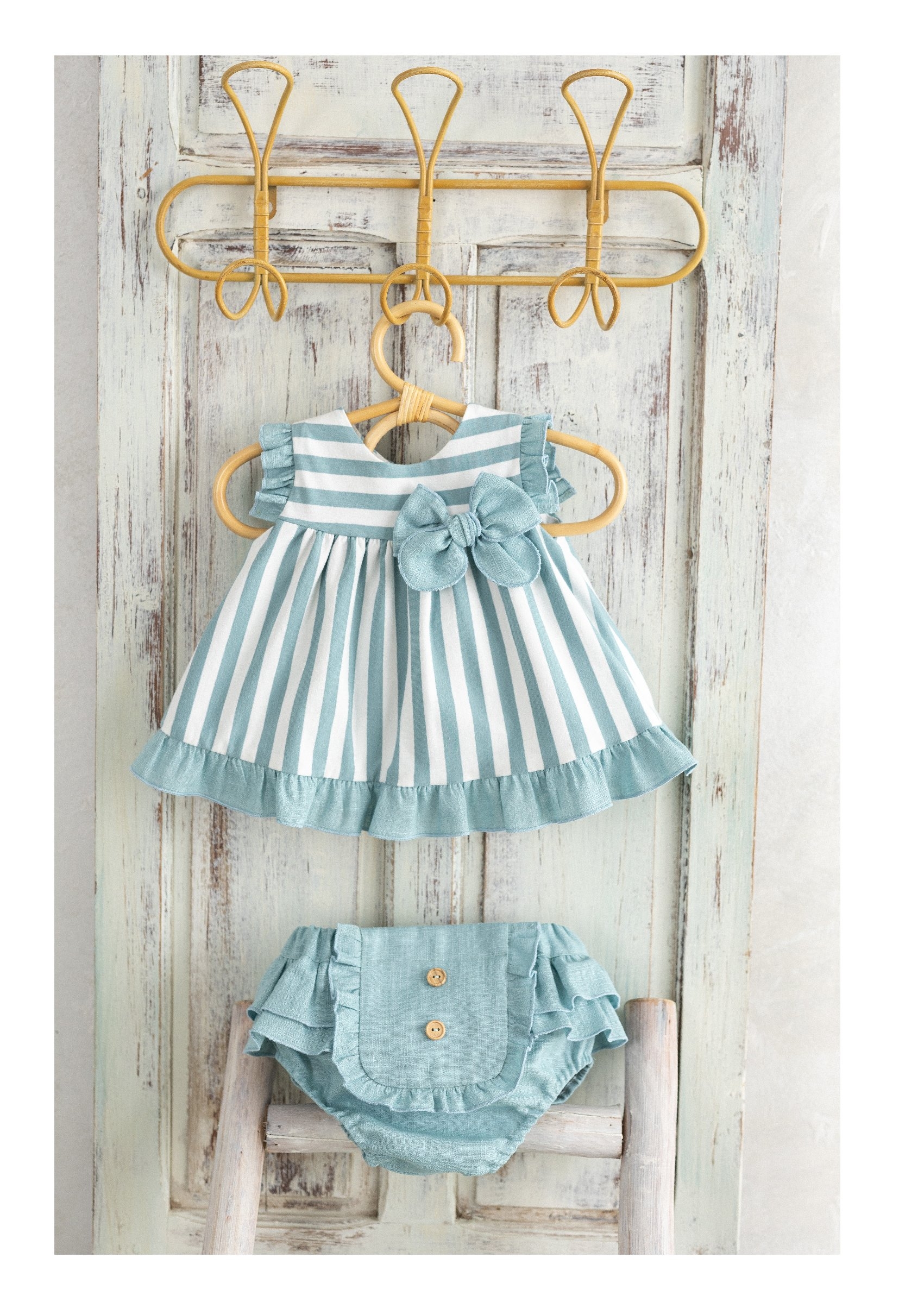 Jesusito catalina de medicis con vuelo de la marca Basmarti. Jesusito a rayas verde agua y blanco combinadas simultaneamente. Vestido de tirantes con un sútil volante en las mangas. Tiene un pequeño corte que le da vuelo y un toque sofisticado. Ademas, como objeto decorativo lleva un pequeño lazo en un lado. Cierra por la parte de atras con votones y un lazo. La braguita simula dos botones en el centro y dos volantes que empieza en el centro y recorre toda la prenda.