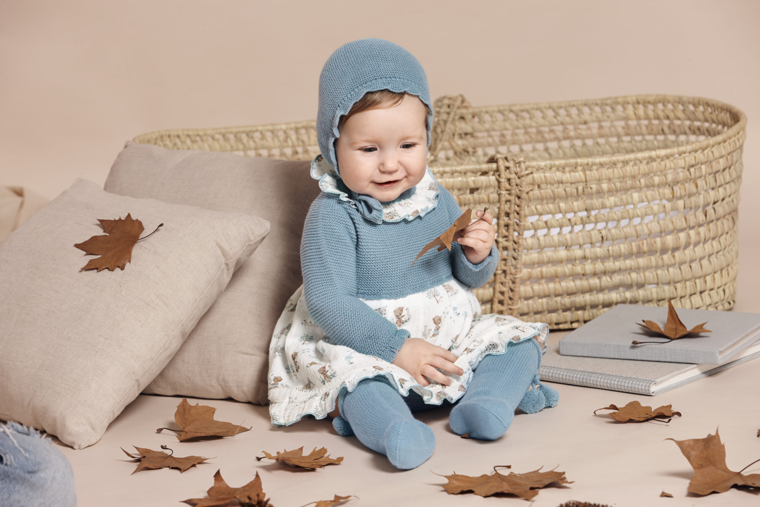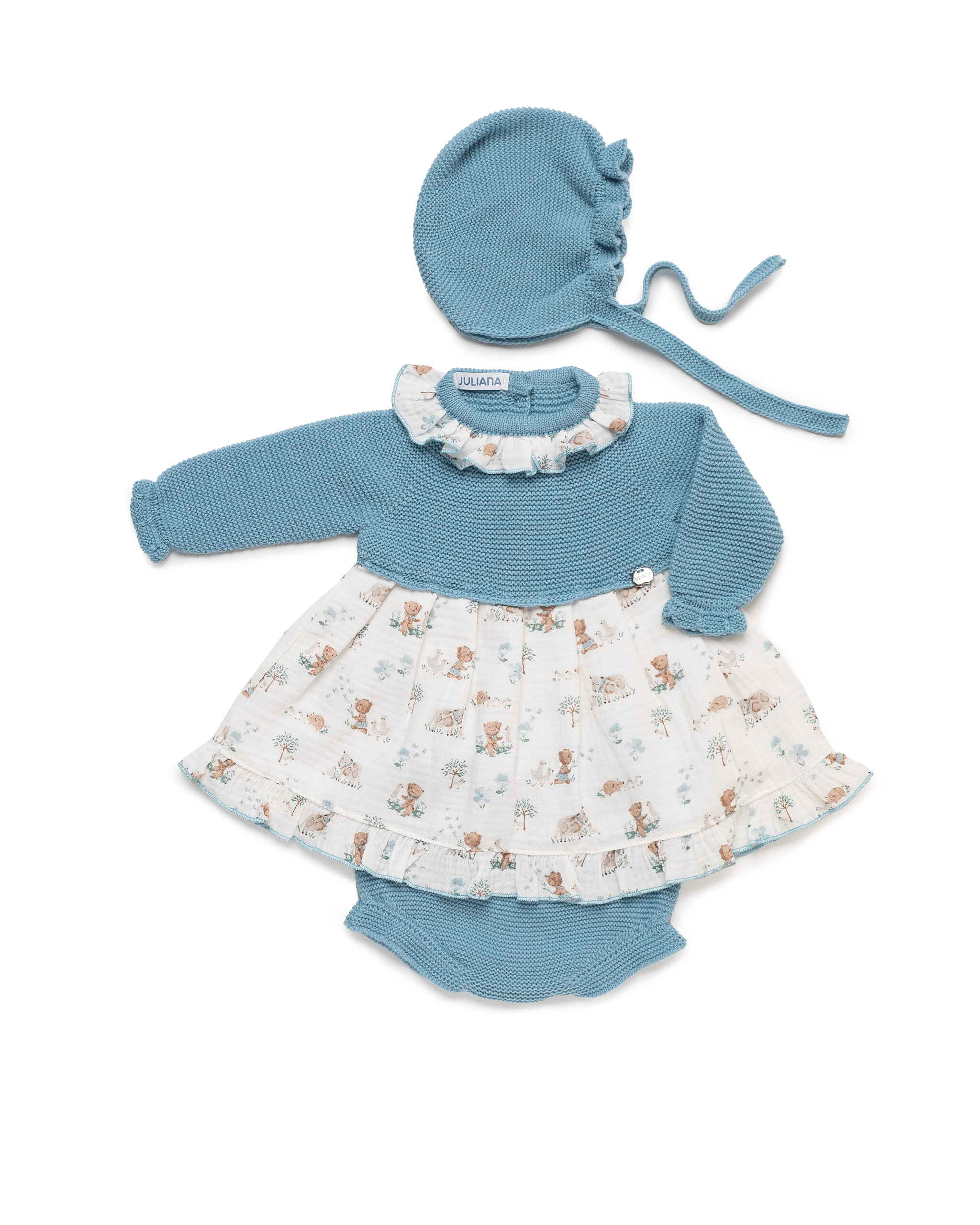 Bonito jesusito de manga larga de la marca Juliana. Tiene cuerpo de punto de manga larga en tono azul nube y falda con estampado de animalitos en color azul y marron. Lleva volante en el cuello con el mismo estampado de la falda. Braguita y capota a juego en tono azul nube. Cierre por detras para facilitar la puesta.
