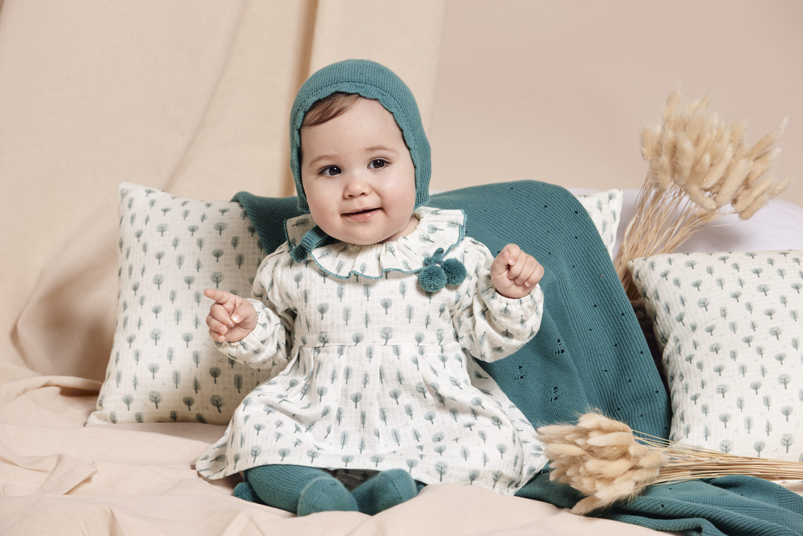 Bonito jesusito de manga larga de la marca Juliana. Esta confeccionado en fondo blanco con estampado de arboles. Lleva volante en el cuello con el mismo estampado de arboles. Tiene un corte en la cintura y lleva dos pompones en color verde baltico como decoracion. Cierre por detras para facilitarla puesta. Braguita a juego con mismo estampado de arboles. Capota a juego en tono verde baltico.