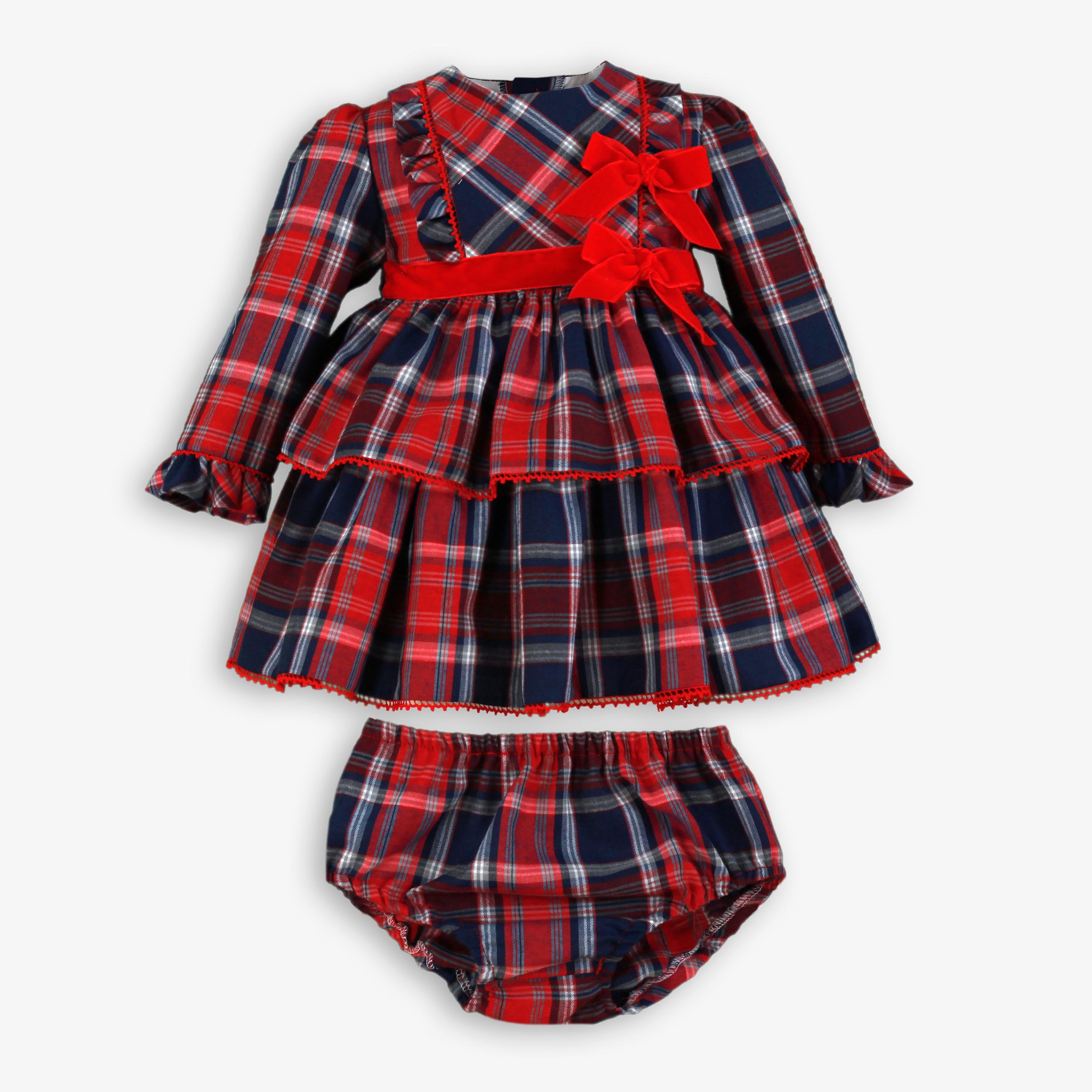 Maravilloso jesusito de manga larga de cuadro escoces de la marca Miranda. Confeccionado en tejido estampado de cuadro escoces en color rojo y marino. Corte en la cintura con tira de terciopelo rojo y dos grandes lazadas de terciopelo. La falda es voluminosa con 2 grandes volantes. Braguita en el mismo color estampado de cuadro escoces. Cierre en la espalda.