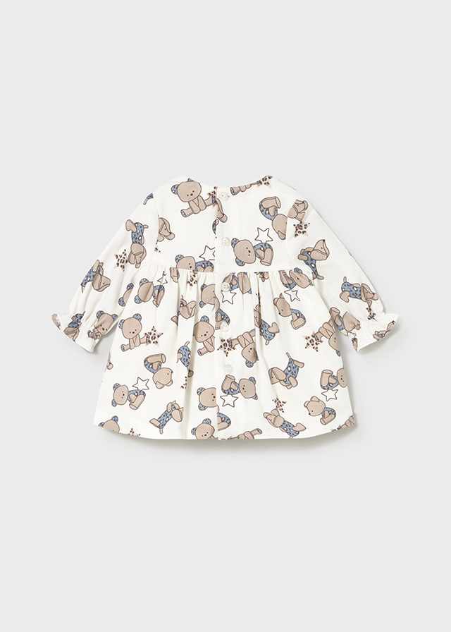 Vestido de manga larga con puños elásticos. Cuello redondo. Cierre con botones en la espalda para facilitar la puesta de la prenda. Singular diseño con tejido fantasia para sus momentos mas especiales. Modelo con forro interior. Prenda con forro 100% algodón.