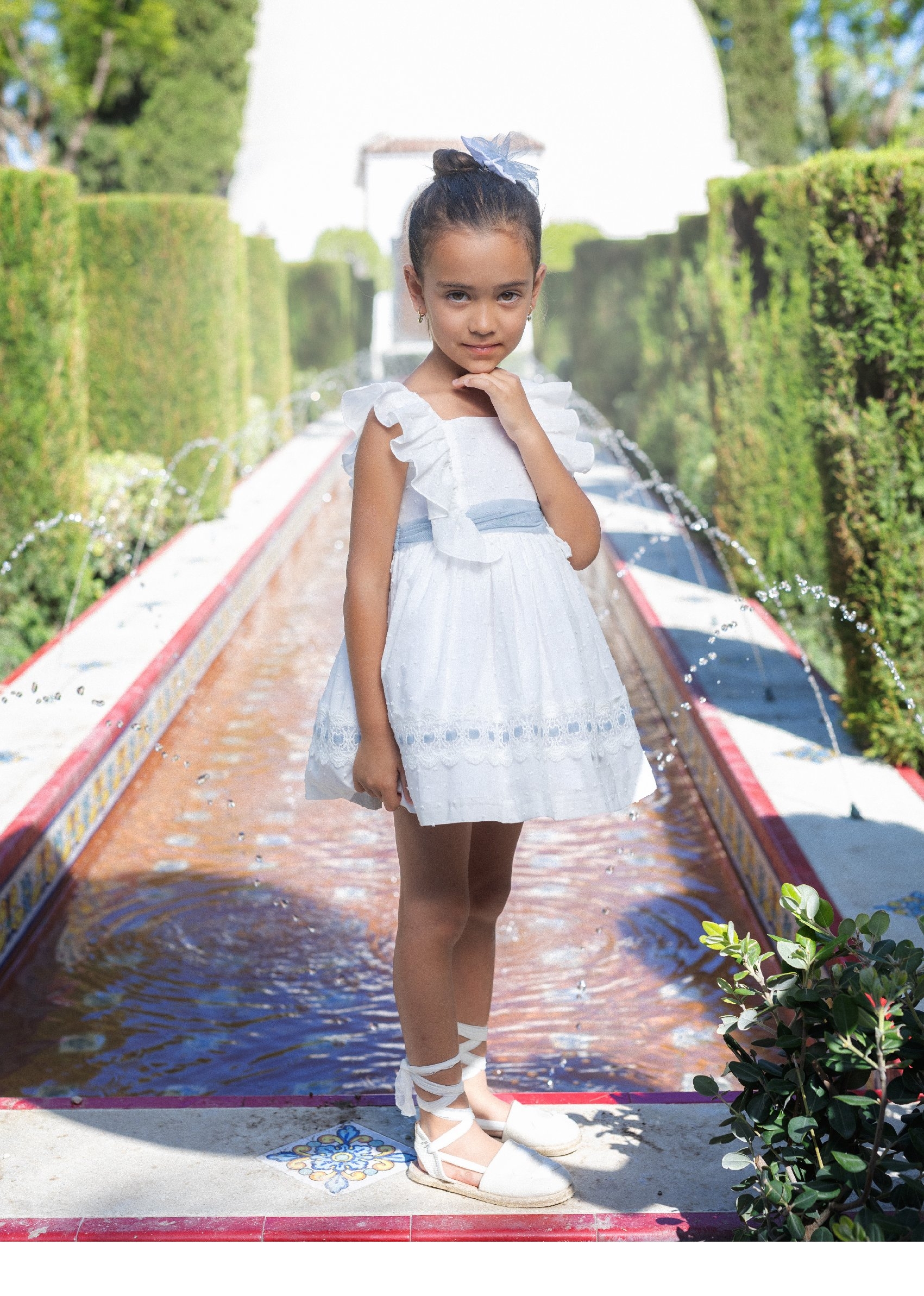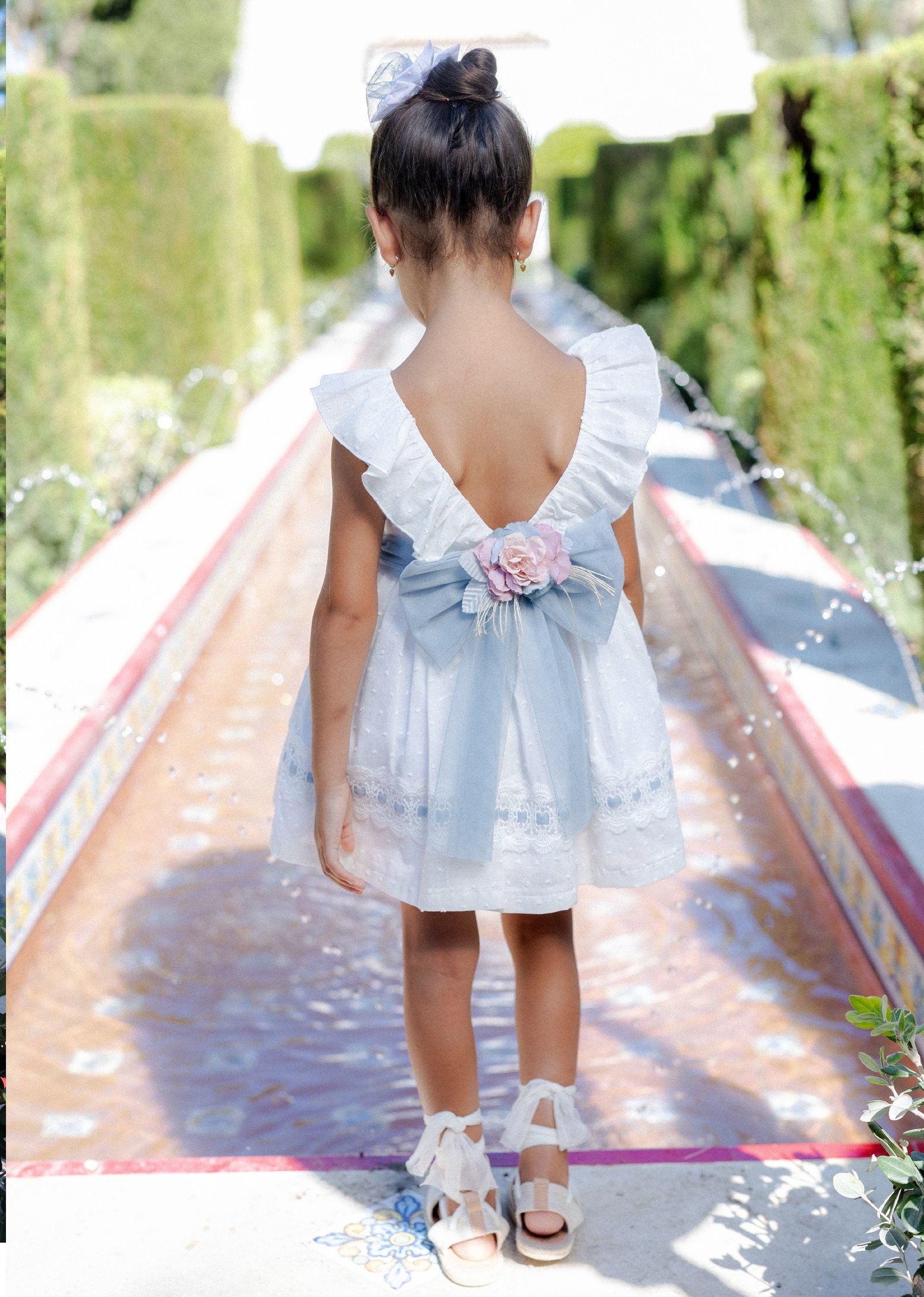 Maravilloso vestido infantil de ceremonia sin mangas para niña de la marca Basmarti. Está confeccionado totalmente en plumeti blanco. Tiene un corte en la cintura con una tira de tul azul empolvado para darle un aire mas sofisticado. Al final lleva una tira de encaje con tul azul empolvado. En los hombros lleva volantes hasta el corte de la cintura hasta la espalda. Cierra por la parte trasera con dos botones y un gran escote, acompañado de un gran lazo azul de tul.