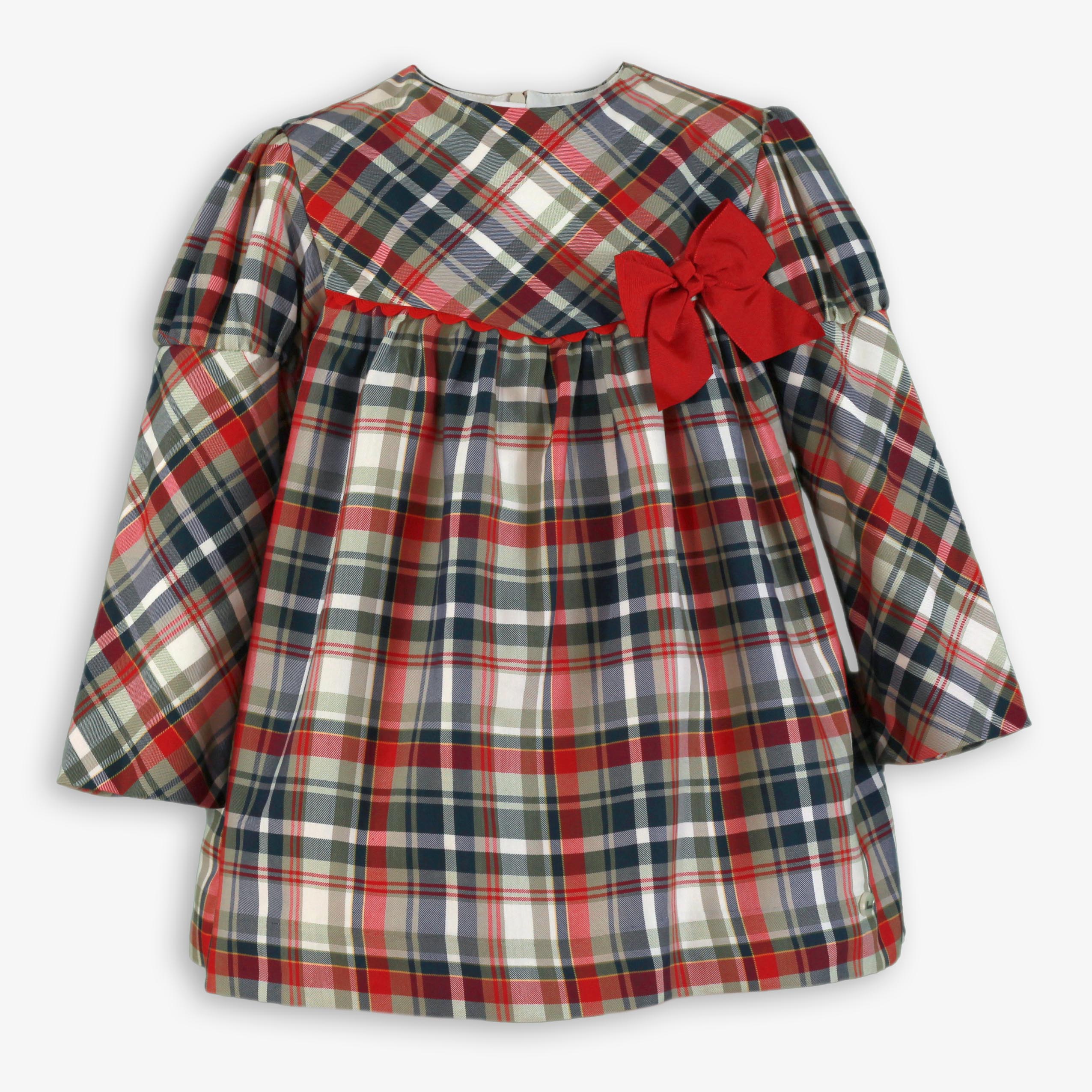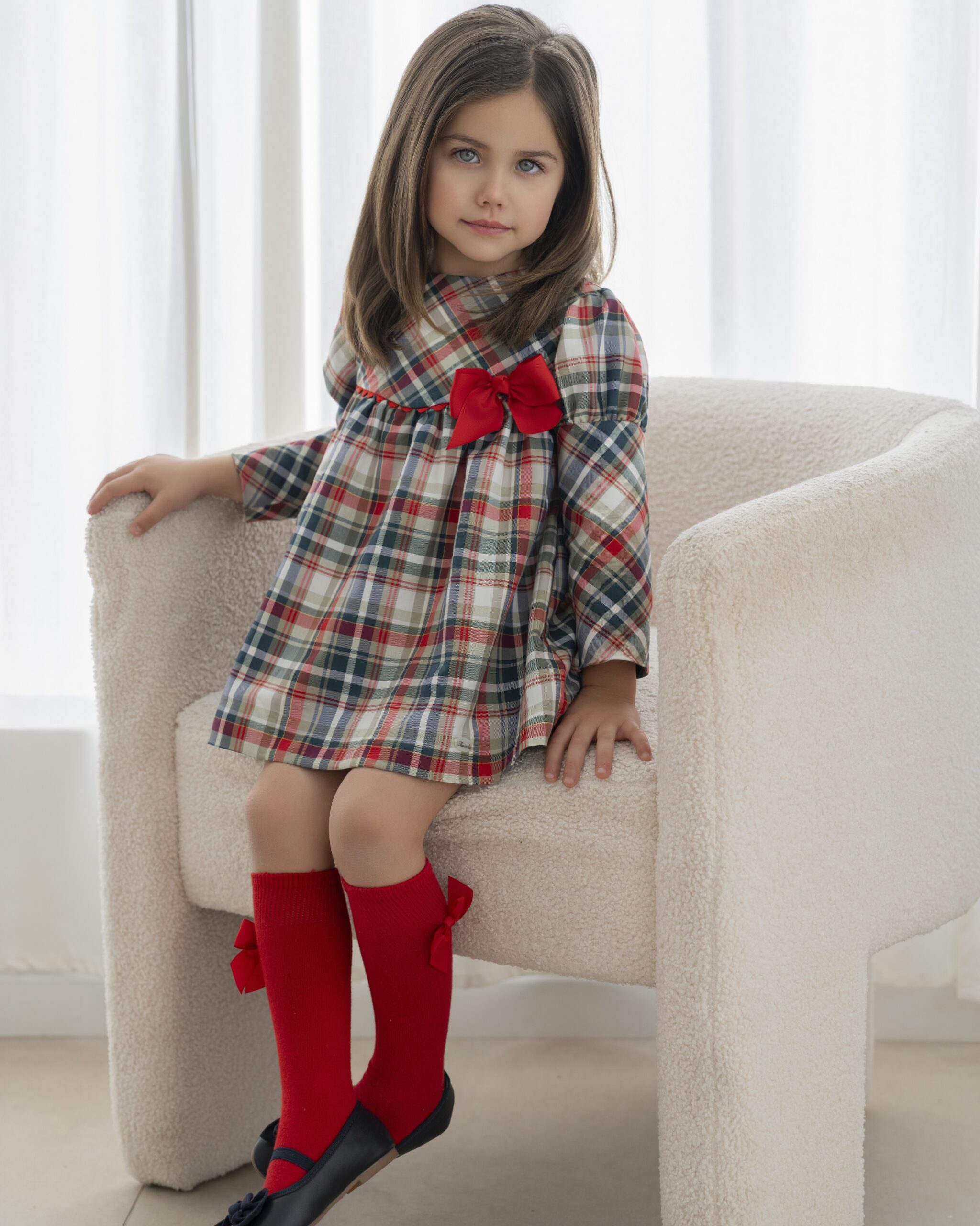 Maravilloso vestido de manga larga de la marca Miranda. Esta confeccionado en cuadro escoces en rojo y marino con corte alto. LLeva un ribete rojo en el corte y gran lazada roja en un lado. Cierre por detras con cremallera.