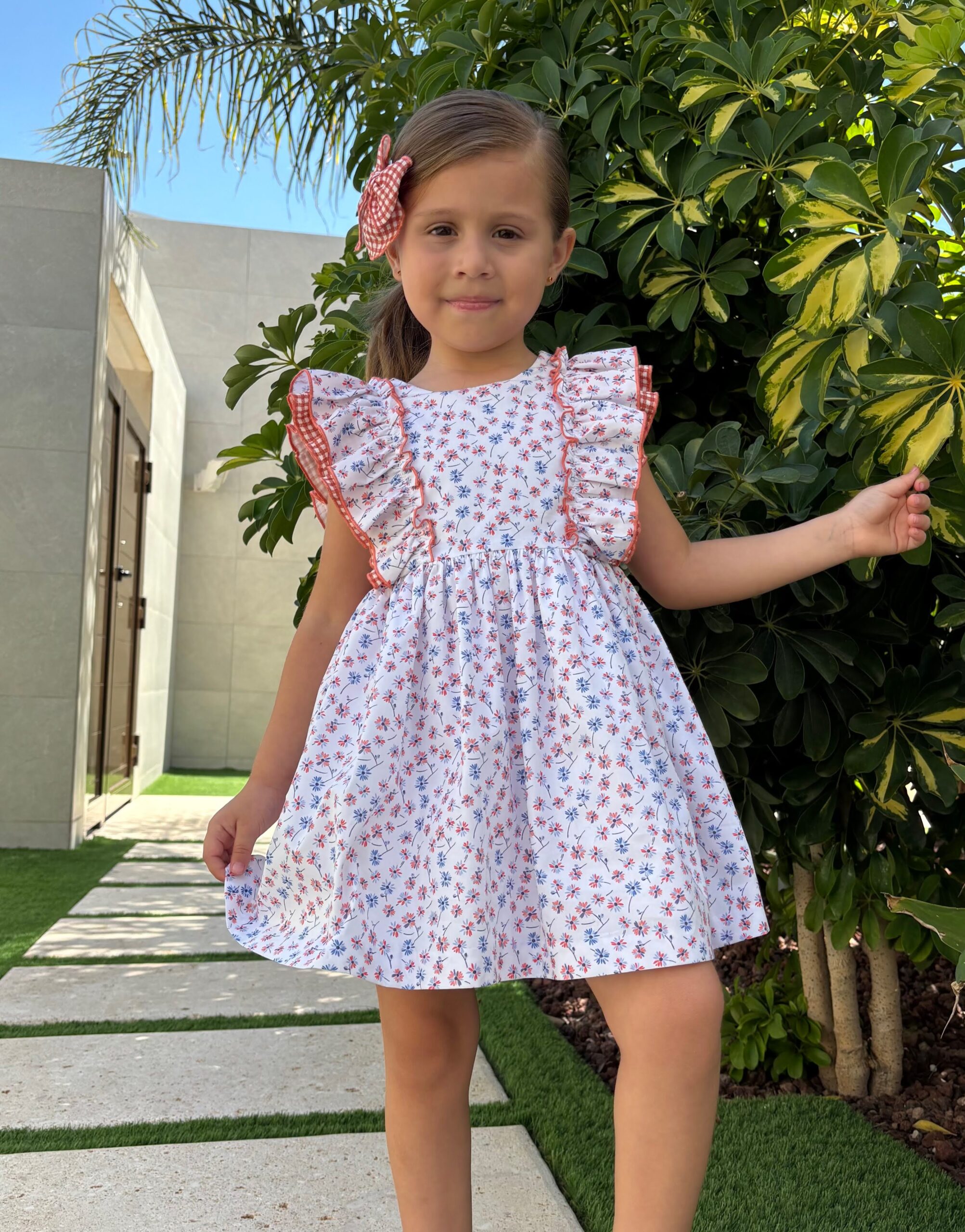 Bonito vestido sin mangas de la marca Daniesty. Esta confeccionado en estampado de florecitas. Lleva corte en la cintura para darle vuelo, ademas luce dos volantes en los hombros uno de la misma tela del vestido y otro en cuadro vichy y va desde la parte trasera hasta la parte delantera. Lleva escote en «V» por la parte trasera. Cierre por detras.