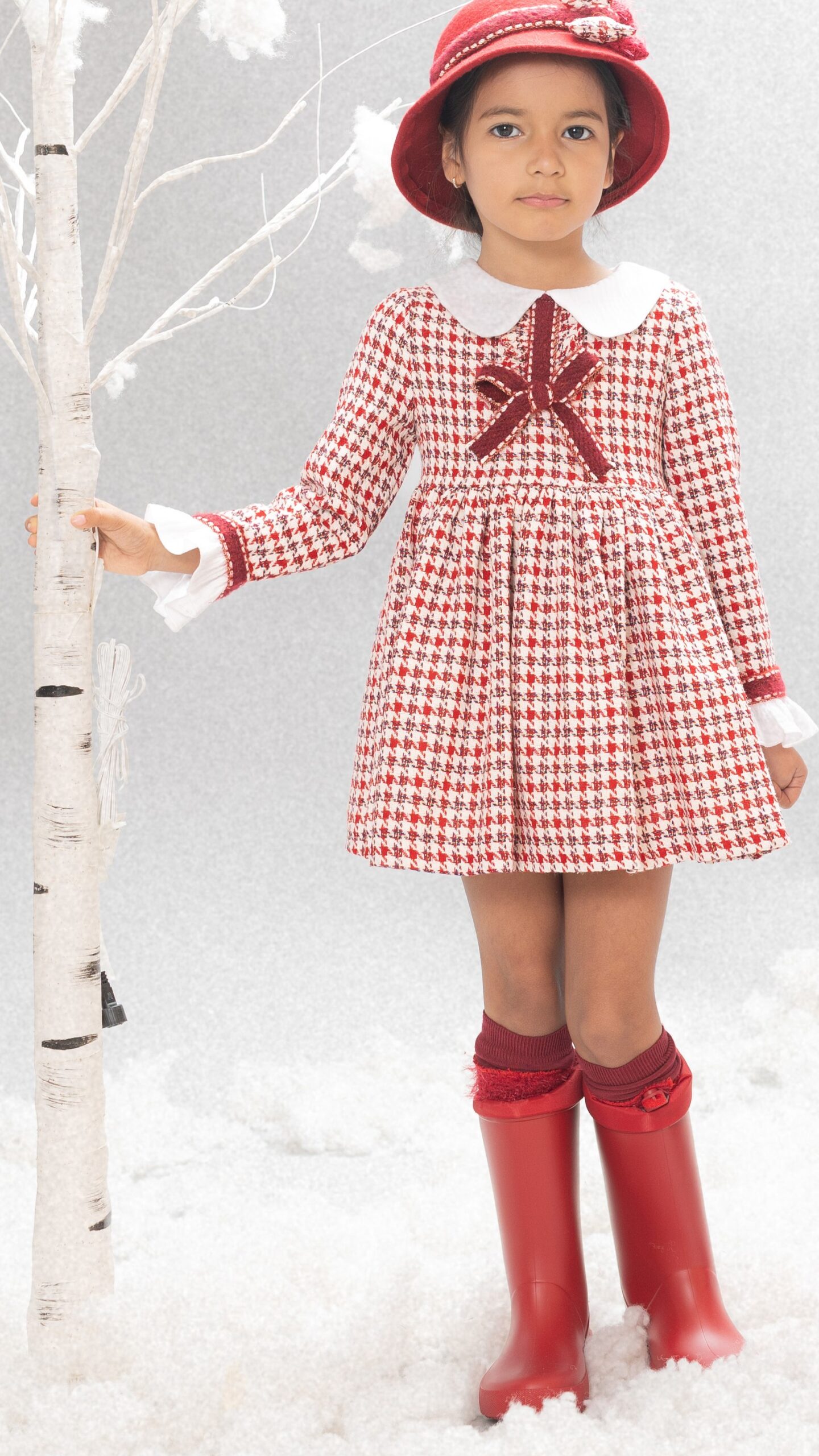 Increible vestido con vuelo de niña de la marca Basmarti. Vestido con estampado en rojo, lleva cuello en blanco dandole un toque mas sofisticado. Tiene un corte en la cintura que le da un gran vuelo al vestido. Ademas lleva volantes en los puños simulando a una camisa que le da un toque mas elegante. Tiene un enorme lazo rojo en el centro del pecho.